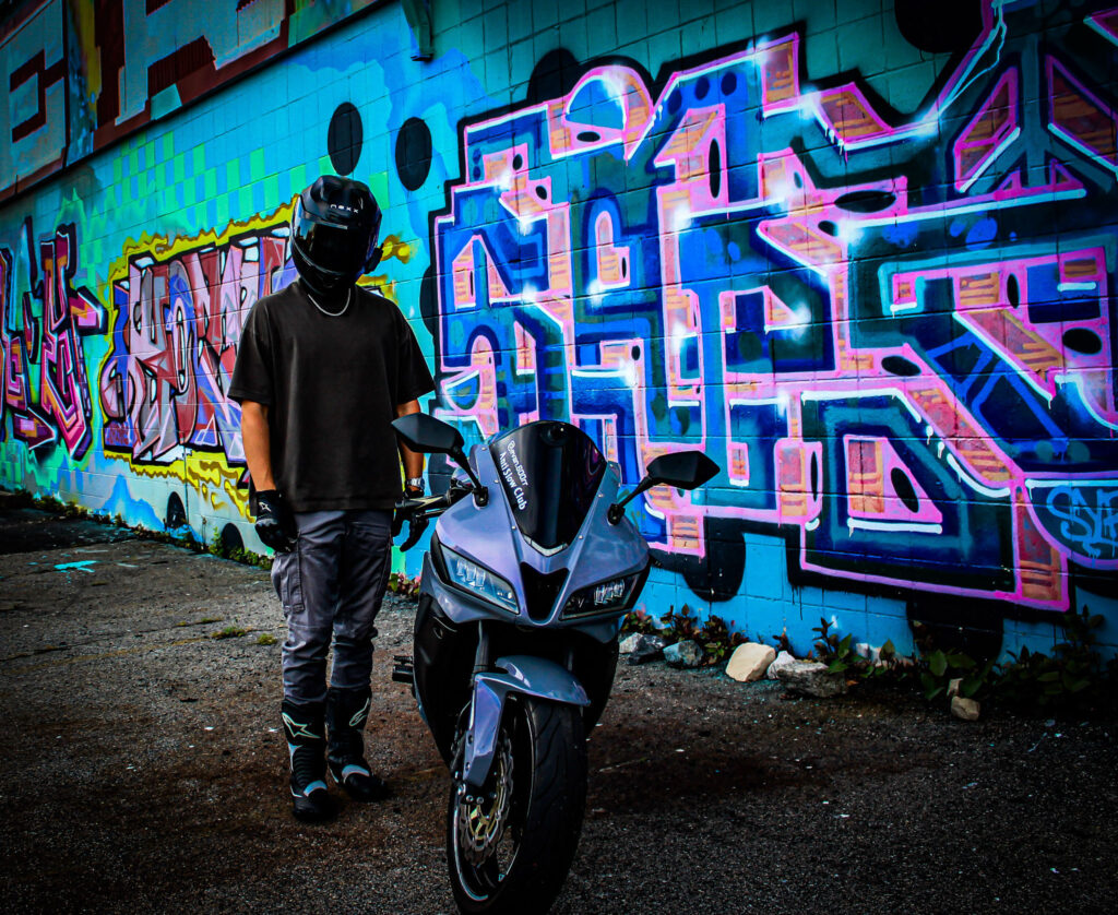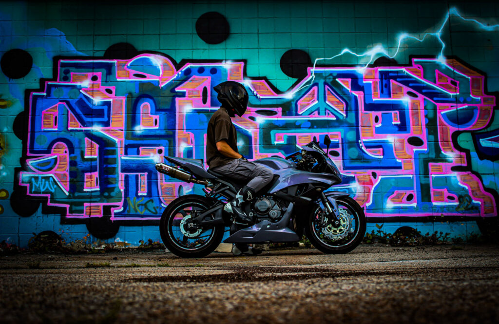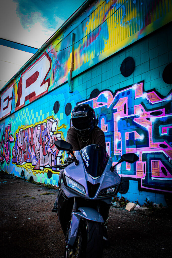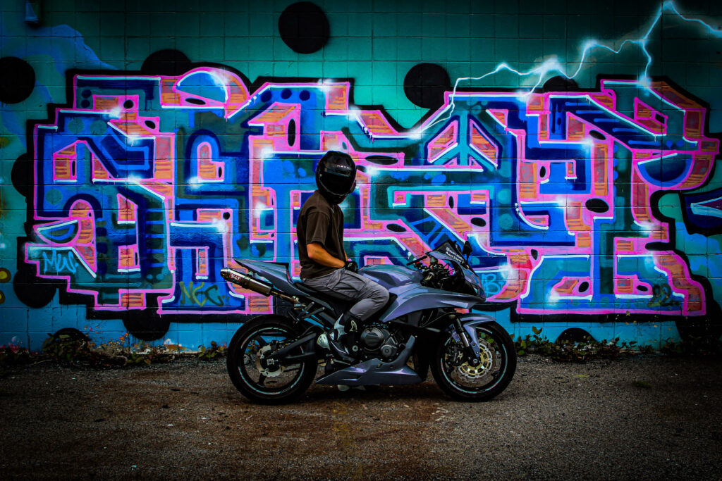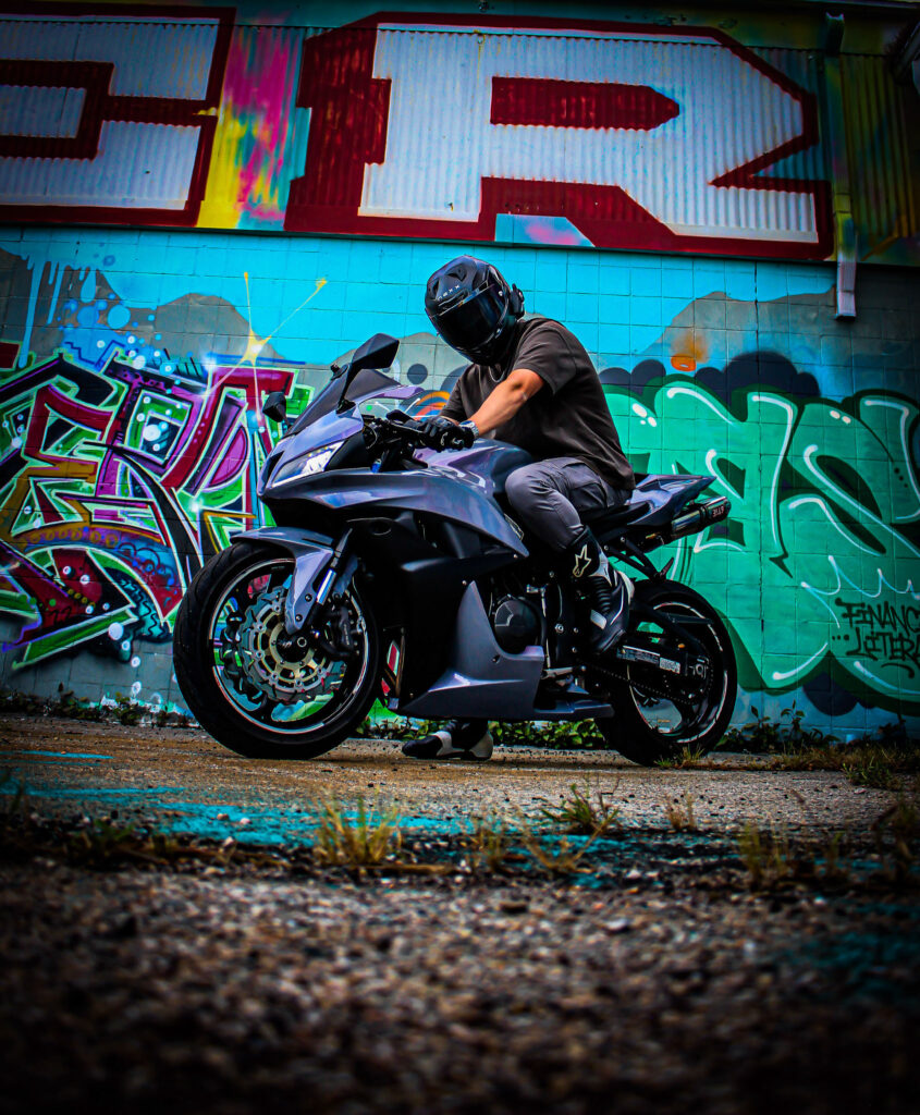 Evan was my second-ever client to work with me. I met him through Scottie, and I don’t feel I would be as far in the community if it weren’t for him. He has opened doors for me that I never thought possible. Another client of mine found this graffiti wall through another biker; she brought Evan and me here. I love the location of this shoot because of all of the colors that contrasted and worked so well with the color of the bike. The 2008 Honda CBR600RR is a popular, lightweight supersport bike known for its nimble handling and strong performance from a 599cc inline-four engine, featuring Honda’s reliable fuel injection, an undertail exhaust for clean aesthetics, and a unique, rider-friendly riding position with features like a built-in fuel gauge and electronic steering damper (HESD) for stability, making it comfortable for street riding while still track-capable, with owners praising its high-revving power and excellent balance.
