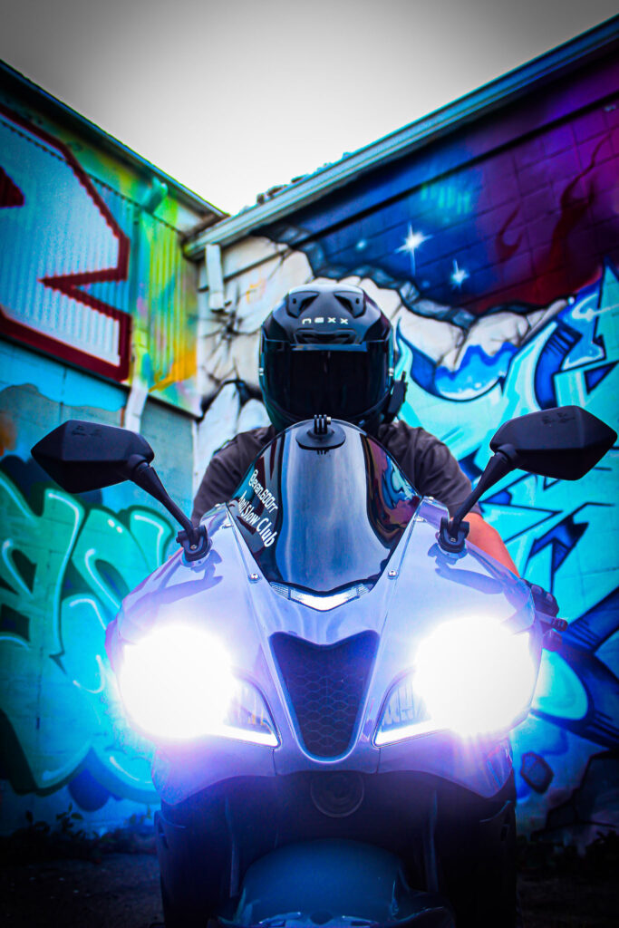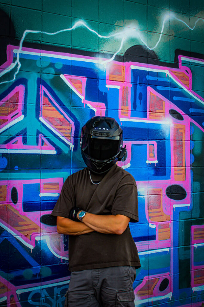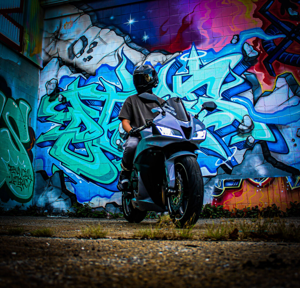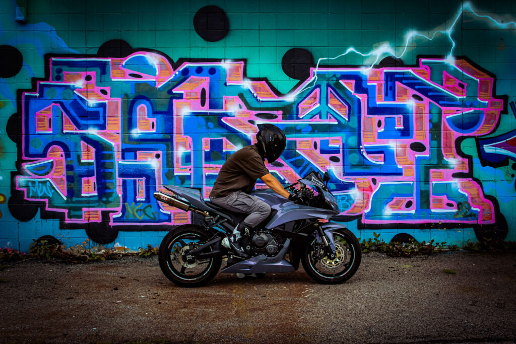 Evan was my second-ever client to work with me. I met him through Scottie, and I don’t feel I would be as far in the community if it weren’t for him. He has opened doors for me that I never thought possible. Another client of mine found this graffiti wall through another biker; she brought Evan and me here. I love the location of this shoot because of all of the colors that contrasted and worked so well with the color of the bike. The 2008 Honda CBR600RR is a popular, lightweight supersport bike known for its nimble handling and strong performance from a 599cc inline-four engine, featuring Honda’s reliable fuel injection, an undertail exhaust for clean aesthetics, and a unique, rider-friendly riding position with features like a built-in fuel gauge and electronic steering damper (HESD) for stability, making it comfortable for street riding while still track-capable, with owners praising its high-revving power and excellent balance.