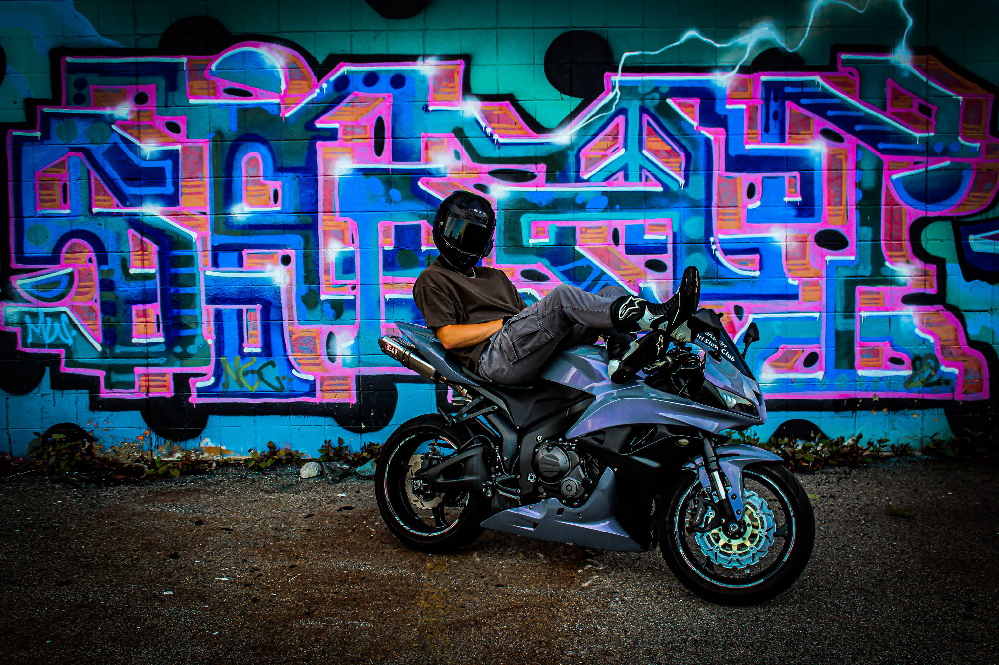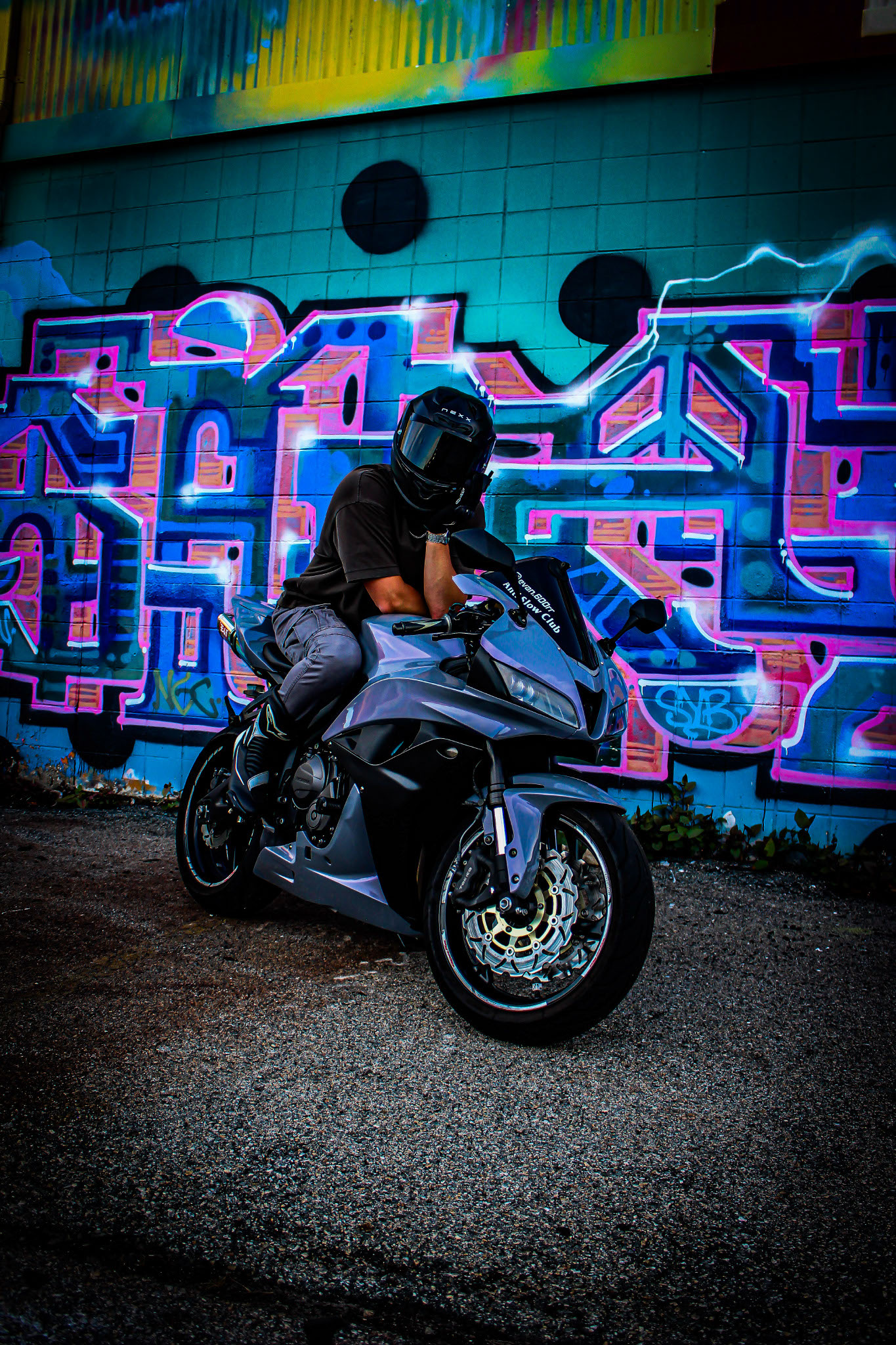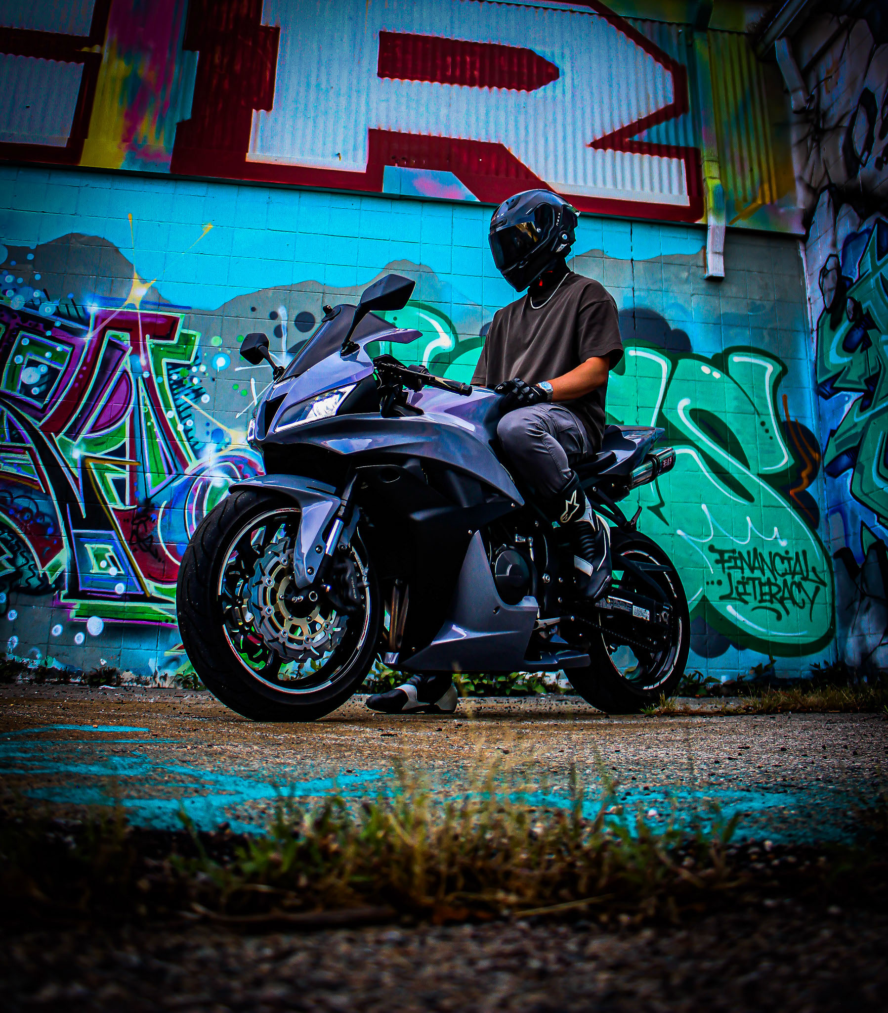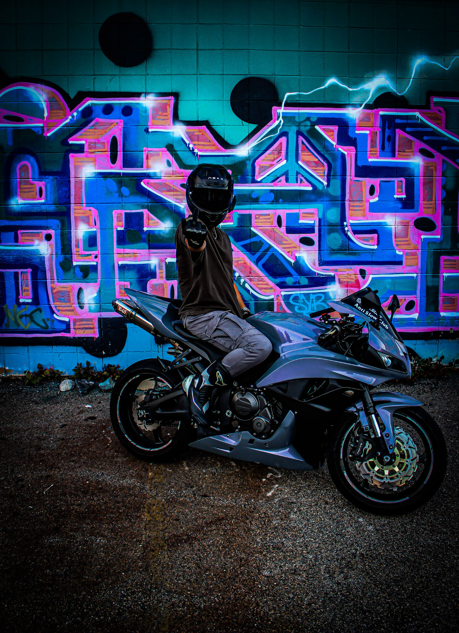 Evan was my second-ever client to work with me. I met him through Scottie, and I don’t feel I would be as far in the community if it weren’t for him. He has opened doors for me that I never thought possible. Another client of mine found this graffiti wall through another biker; she brought Evan and me here. I love the location of this shoot because of all of the colors that contrasted and worked so well with the color of the bike. The 2008 Honda CBR600RR is a popular, lightweight supersport bike known for its nimble handling and strong performance from a 599cc inline-four engine, featuring Honda’s reliable fuel injection, an undertail exhaust for clean aesthetics, and a unique, rider-friendly riding position with features like a built-in fuel gauge and electronic steering damper (HESD) for stability, making it comfortable for street riding while still track-capable, with owners praising its high-revving power and excellent balance.