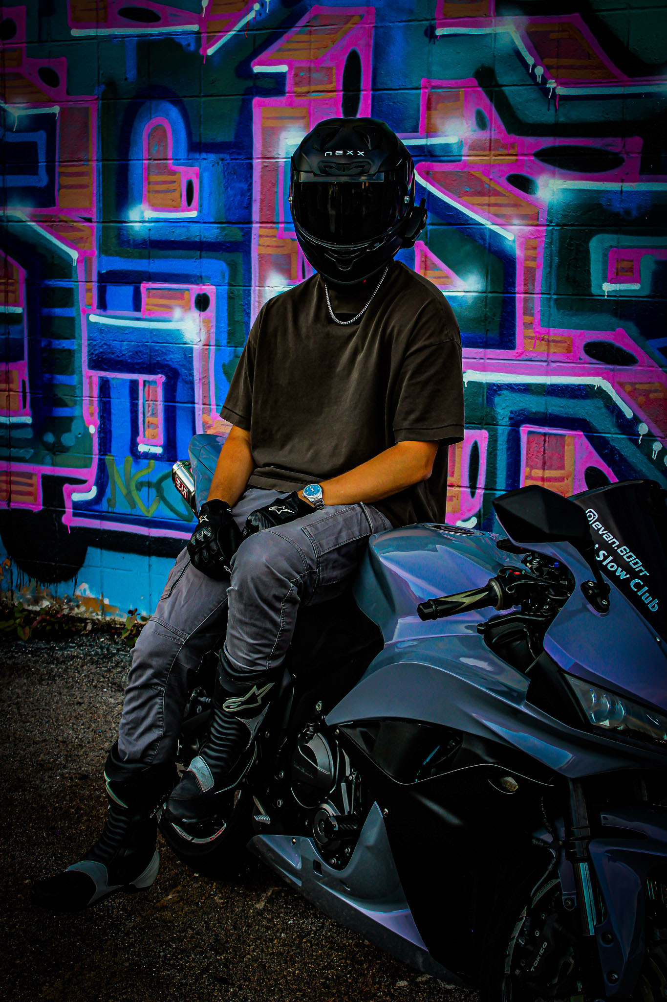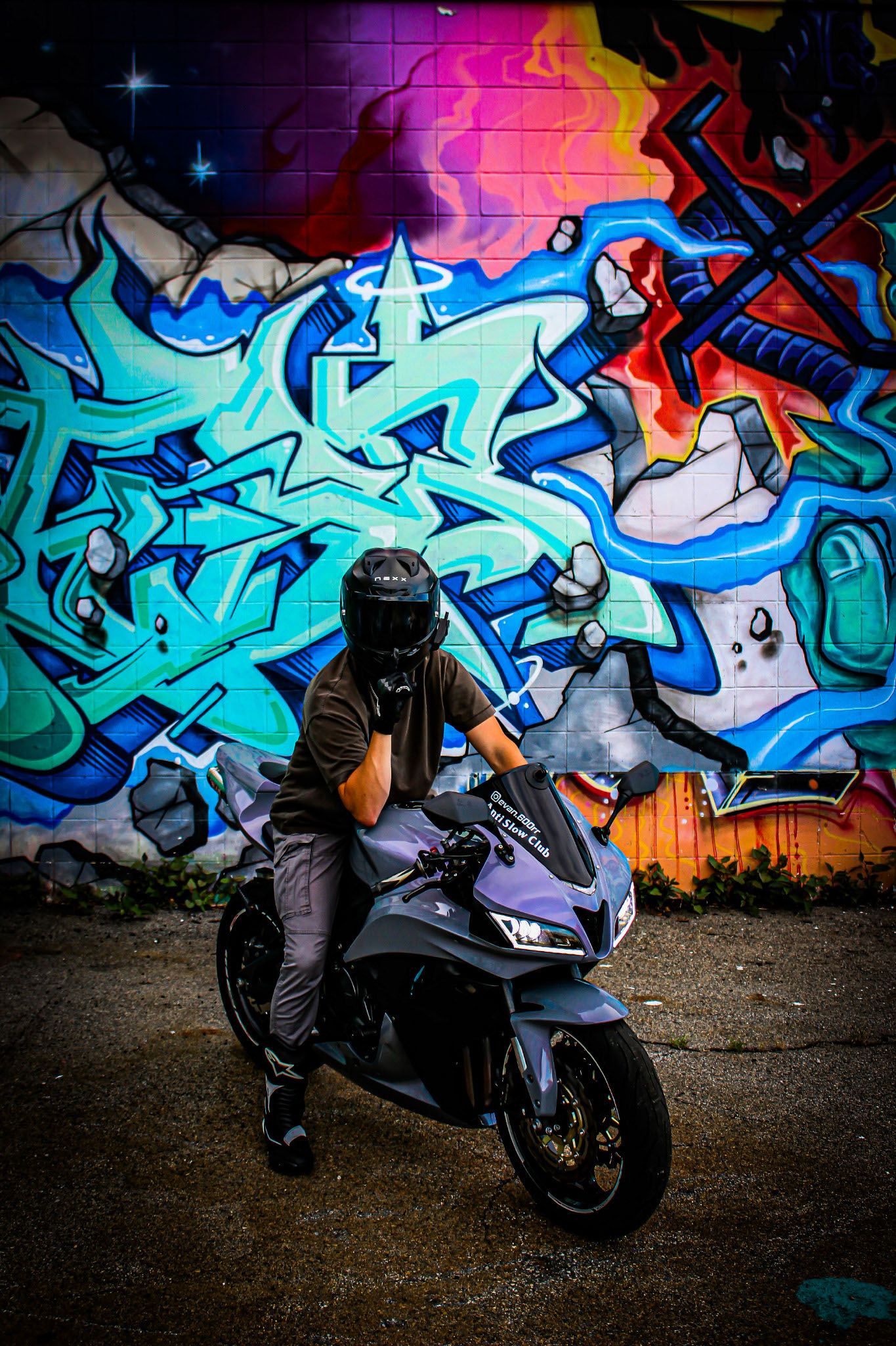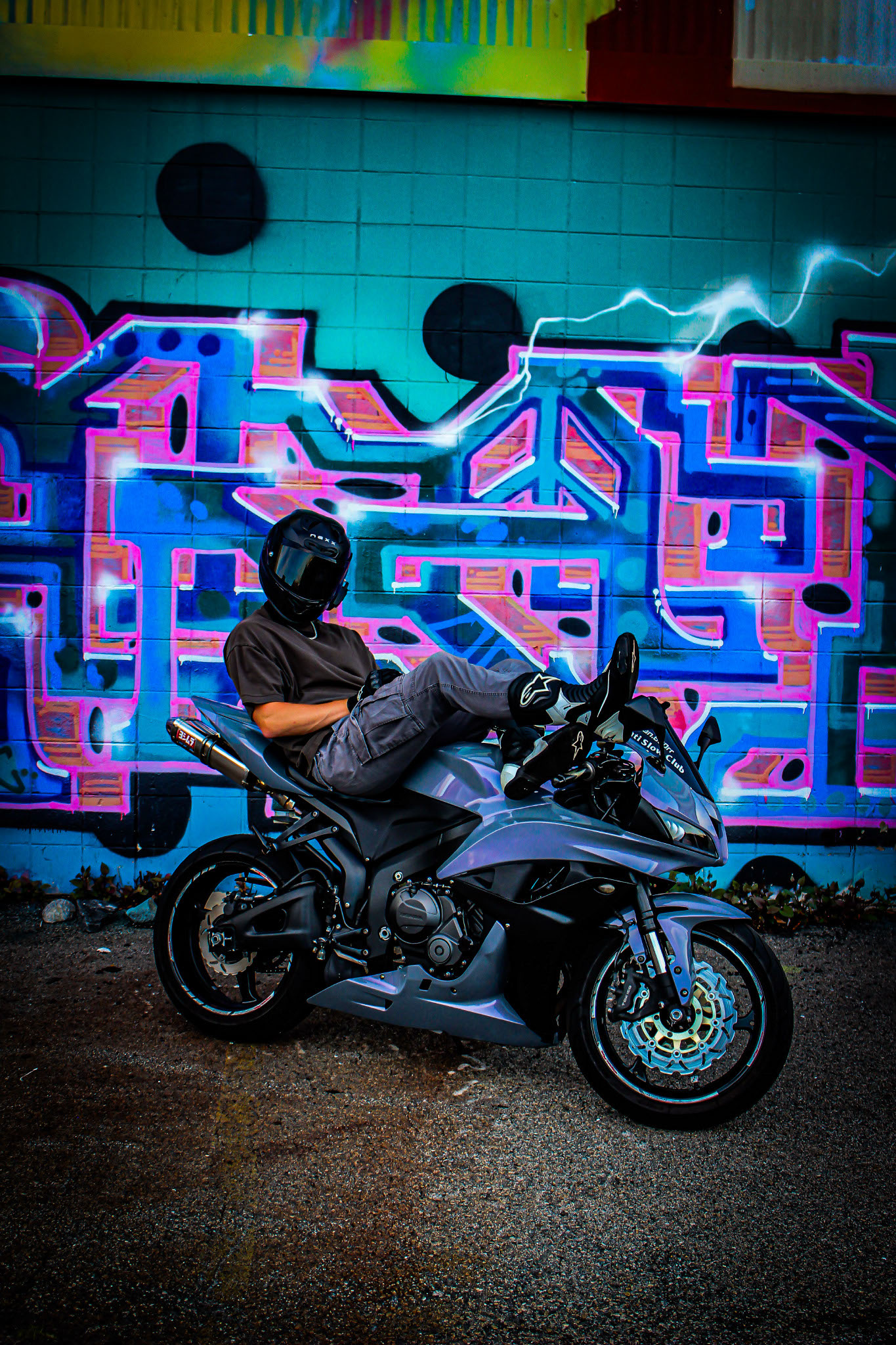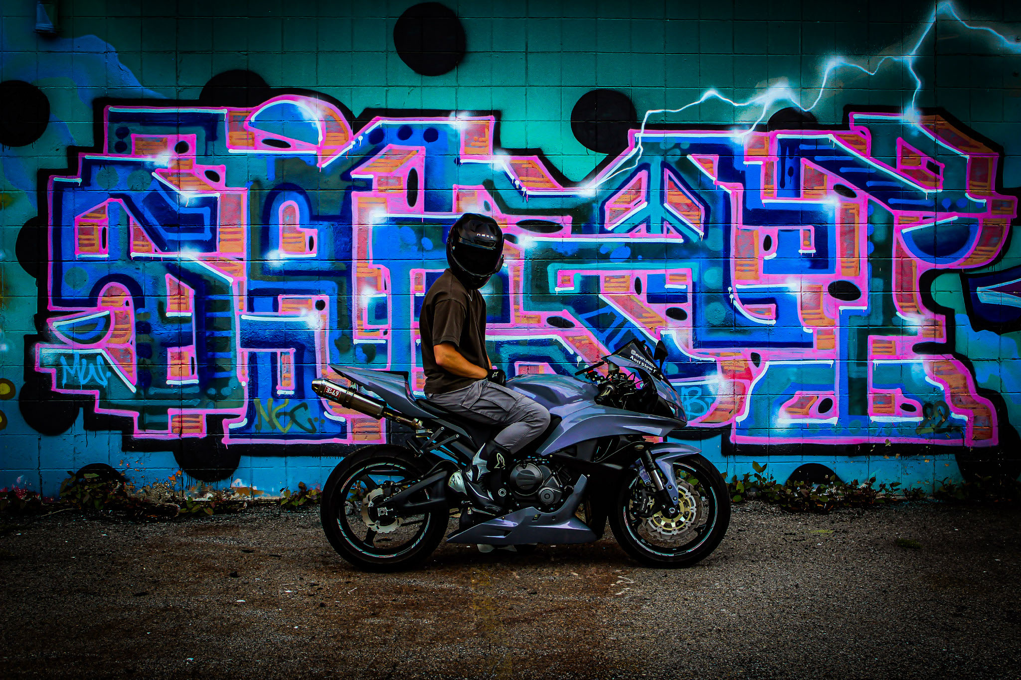 Evan was my second-ever client to work with me. I met him through Scottie, and I don’t feel I would be as far in the community if it weren’t for him. He has opened doors for me that I never thought possible. Another client of mine found this graffiti wall through another biker; she brought Evan and me here. I love the location of this shoot because of all of the colors that contrasted and worked so well with the color of the bike. The 2008 Honda CBR600RR is a popular, lightweight supersport bike known for its nimble handling and strong performance from a 599cc inline-four engine, featuring Honda’s reliable fuel injection, an undertail exhaust for clean aesthetics, and a unique, rider-friendly riding position with features like a built-in fuel gauge and electronic steering damper (HESD) for stability, making it comfortable for street riding while still track-capable, with owners praising its high-revving power and excellent balance.